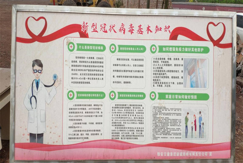 一是創(chuàng)新宣傳形式,利用公司QQ群、微信群、推送《中華人民共和國傳染病防治法》、《四川省應(yīng)對新冠肺炎疫情分區(qū)分級差異化防控指南(第二版)》、《雅安市新型冠狀病毒肺炎疫情防控工作要點(diǎn)指引》等法律法規(guī),每日持續(xù)有效的傳播疫情防控的信息,加大健康教育宣傳,引導(dǎo)職工不信謠不傳謠,營造良好的輿論環(huán)境。二是落實(shí)責(zé)任主體,在公司、各項目部張貼疫情防控法制宣傳展板、懸掛宣傳橫幅、發(fā)放防控宣傳冊,設(shè)立疫情防控教育專欄,向項目參建人員宣講疫情防控知識,做好疫情群防群治工作,營造濃厚的防控宣傳氛圍。三是精準(zhǔn)發(fā)力,組織已進(jìn)場勞務(wù)人員開展疫情防控及復(fù)工復(fù)產(chǎn)安全教育培訓(xùn),確保項目復(fù)工復(fù)產(chǎn)和疫情防控工作有序推進(jìn)。