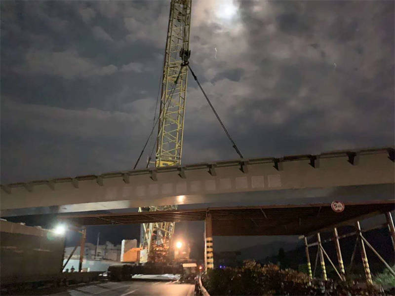 雅西跨線橋混凝土預制箱梁共計4片,本次架設(shè)的箱梁重140噸、長55余米,體積大、自身重、運輸困難,且投入的大型機械設(shè)備較多,施工組織難度大。為順利完成架設(shè)任務,市交通局多次組織召開專題會議,提前謀劃、細致安排、優(yōu)化組織,制定了施工專項方案和應急措施。