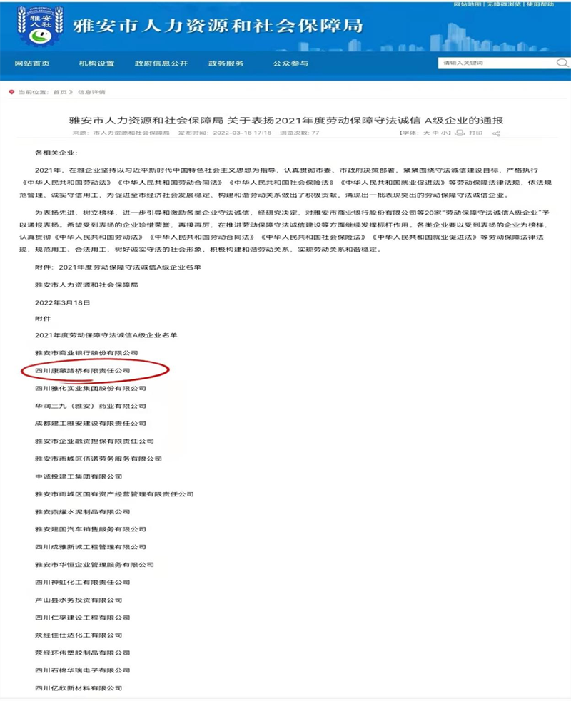 近日,根據(jù)《雅安市人力資源和社會保障局關(guān)于表揚2021年度勞動保障守法誠信 A級企業(yè)的通報》,雅安交通建設(shè)(集團)有限責(zé)任公司下屬四川康藏路橋有限責(zé)任公司榮獲2021年度勞動保障守法誠信 A級企業(yè),名列我市“誠信紅榜”。