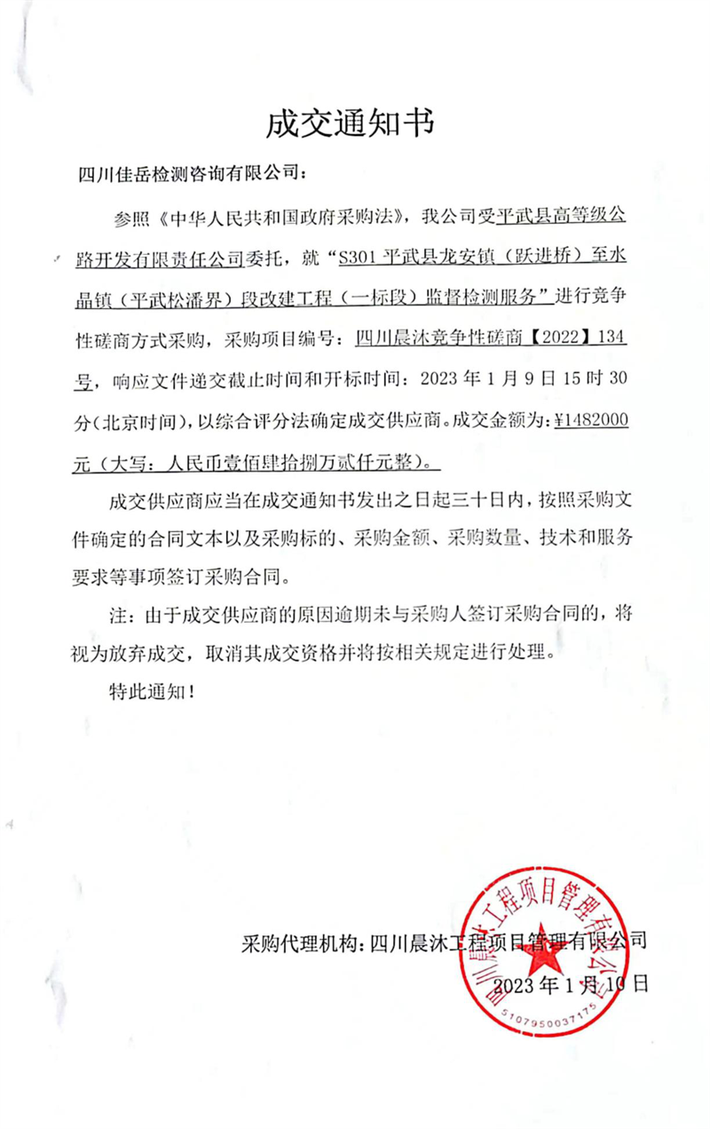 中標(biāo)項目為S301平武縣龍安鎮(zhèn)(躍進橋)至水晶鎮(zhèn)(平武松潘界)段改建工程(一標(biāo)段)監(jiān)督檢測服務(wù)項目,成交金額148萬余元。此次成功中標(biāo)展示了公司的檢測能力和市場競爭力,為公司“走出去”積極承攬市外、省外業(yè)務(wù)增添信心。