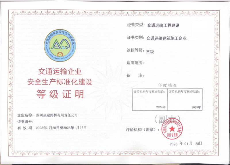 近日,經(jīng)四川省交通運(yùn)輸企業(yè)安全生產(chǎn)標(biāo)準(zhǔn)化評價(jià)機(jī)構(gòu)綜合評定,雅安交建集團(tuán)四川康藏路橋有限責(zé)任公司順利通過安全標(biāo)準(zhǔn)化三級評價(jià)驗(yàn)收并獲得“安全生產(chǎn)標(biāo)準(zhǔn)化三級企業(yè)”等級證明證書。