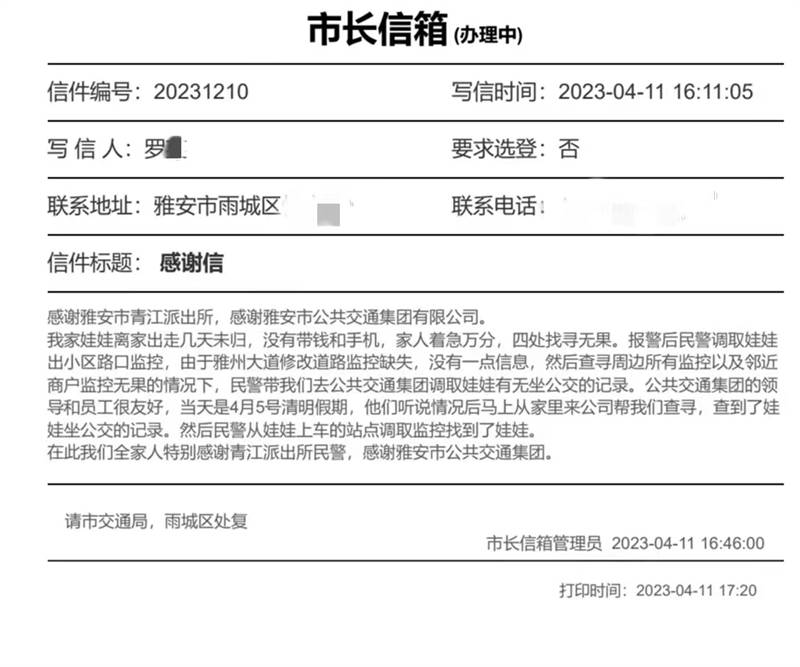 日前,市民羅女士的孩子離家出走,四處尋找無(wú)果。4月5日,時(shí)值清明假期,羅女士來(lái)到公交集團(tuán),希望工作人員幫忙查詢(xún)孩子乘坐公交車(chē)的記錄。得知情況后,公交集團(tuán)值班人員立即通知相關(guān)技術(shù)人員到崗到位,根據(jù)羅女士提供的戶(hù)口簿信息,通過(guò)后臺(tái)查詢(xún)到孩子使用學(xué)生卡在市區(qū)乘坐公交車(chē)的記錄及相關(guān)車(chē)輛的監(jiān)控視頻,并會(huì)同公安干警完整梳理出孩子的活動(dòng)軌跡,不到半個(gè)小時(shí),成功協(xié)助家長(zhǎng)找到離家出走的孩子。事后羅女士帶著感恩之情和禮物,專(zhuān)程到公交集團(tuán)表示感謝,公交集團(tuán)工作人員婉言謝絕了羅女士的禮物。隨后,羅女士在市長(zhǎng)信箱寫(xiě)下了這封誠(chéng)摯的感謝信。