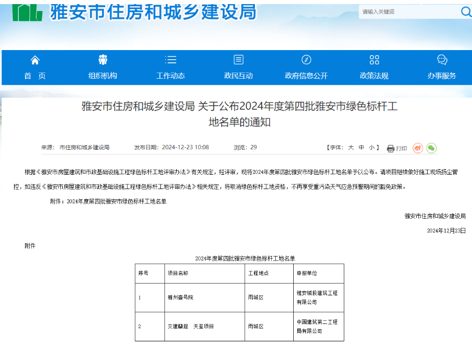 12月23日,雅安市住房和城鄉(xiāng)建設(shè)局發(fā)布了《關(guān)于公布2024年度四批雅安市綠色標(biāo)桿工地名單的通知》,雅安交建集團(tuán)蘭庭•天璽項(xiàng)目,以卓越的綠色實(shí)踐榮獲“雅安市綠色標(biāo)桿工地”殊榮。