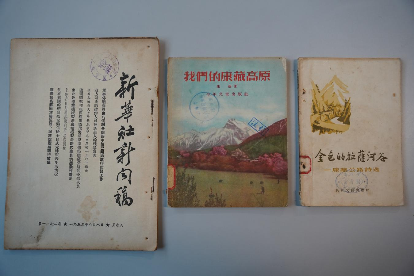此次獲贈文獻具有重要歷史價值,《金色的拉薩河谷(康藏公路詩選)》以詩歌形式記錄了康藏公路(今川藏公路)建設(shè)者的奮斗歷程,其中的不少詩篇被作曲家譜寫成歌曲;《我們的康藏高原》著重描寫了康藏公路的修筑歷程,講述了筑路英雄們的事跡及西藏和平解放后的新面貌;1953年8月8日發(fā)表的新華社新聞稿原件,以第一手資料還原了康藏公路修建期間的重要歷史節(jié)點。