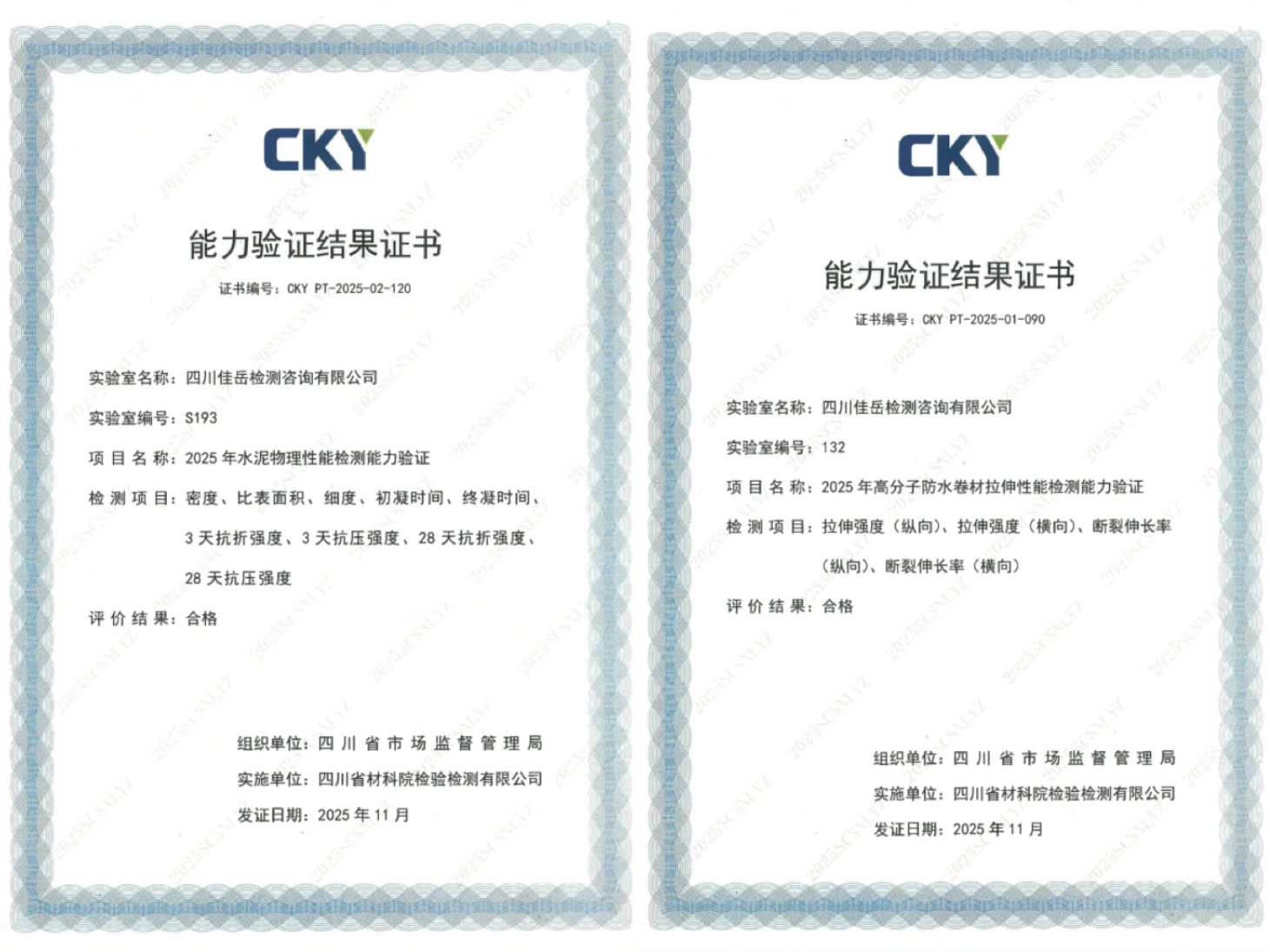 近日,佳岳公司順利完成2025年度檢測能力驗(yàn)證工作,“高分子防水卷材拉伸性能檢測”與“水泥物理性能檢測”兩項(xiàng)項(xiàng)目結(jié)果均獲“滿意”評價(jià)。