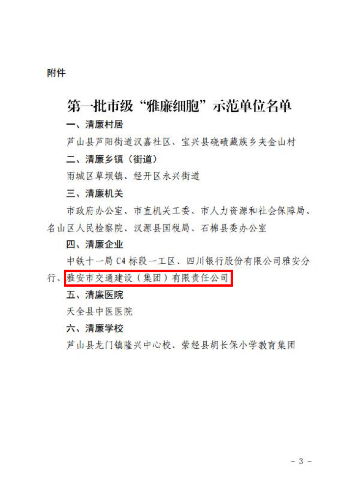 經(jīng)過雅安市黨風(fēng)廉政建設(shè)責(zé)任制領(lǐng)導(dǎo)小組辦公室嚴(yán)格考評(píng)審定,雅安市交通建設(shè)(集團(tuán))有限責(zé)任公司被命名為第一批市級(jí)“雅廉細(xì)胞”示范單位(清廉企業(yè))。