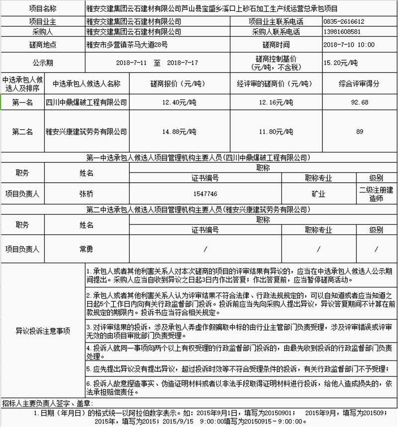雅安交建集團(tuán)云石建材有限公司蘆山縣寶盛鄉(xiāng)溪口上砂石加工生產(chǎn)線(xiàn)運(yùn)營(yíng)總承包項(xiàng)目中選承包人公示