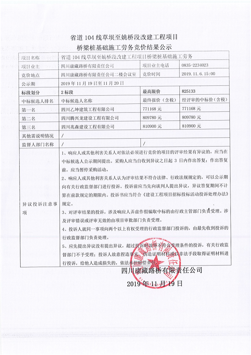 四川康藏路橋有限責(zé)任公司省道104線草壩至姚橋段改建工程項(xiàng)目橋梁樁基礎(chǔ)施工勞務(wù)競價(jià)(2標(biāo)段)結(jié)果公示