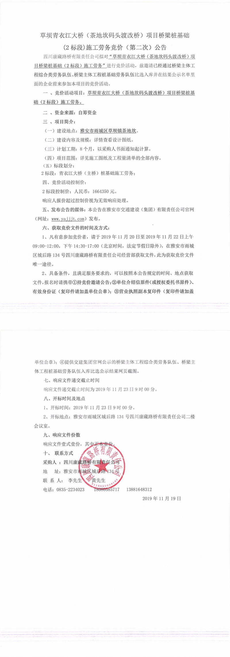 四川康藏路橋有限責(zé)任公司草壩青衣江大橋(茶地坎碼頭渡改橋)項(xiàng)目橋梁樁基礎(chǔ)(2標(biāo)段)施工勞務(wù)競價(jià)(第二次)公告