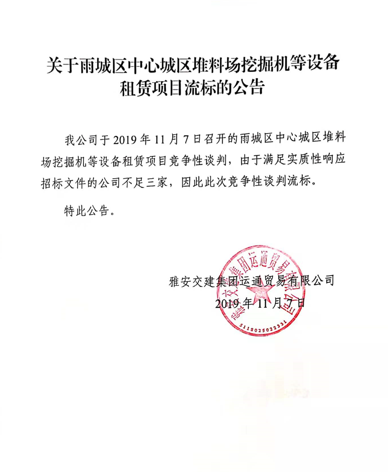雅安交建集團運通貿易有限公司關于雨城區(qū)中心城區(qū)堆料場挖掘機等設備租賃項目流標的公告