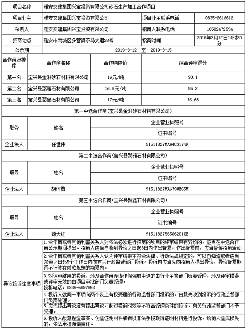 雅安交建集團(tuán)興寶投資有限公司砂石生產(chǎn)加工合作項目公示