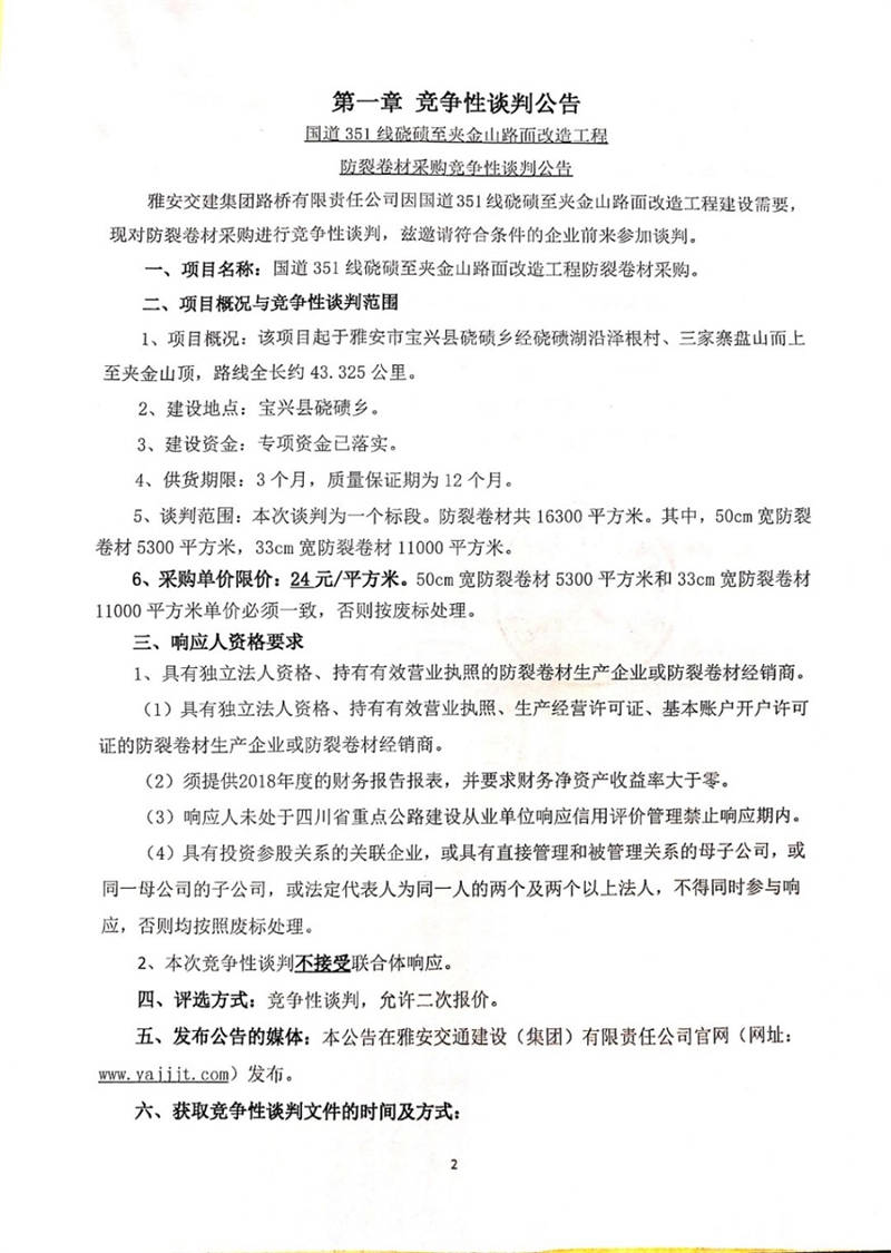 雅安交建集團(tuán)路橋有限責(zé)任公司國道351線磽磧至夾金山路面改造工程防裂卷材采購競(jìng)爭(zhēng)性談判公告