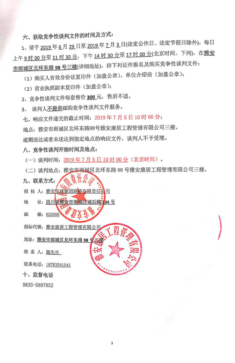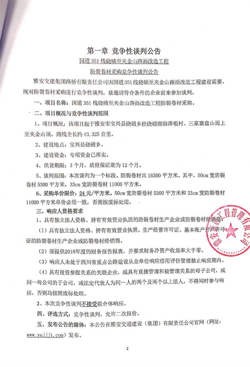 雅安交建集團路橋有限責任公司國道351線磽磧至夾金山路面改造工程防裂卷材采購競爭性談判公告