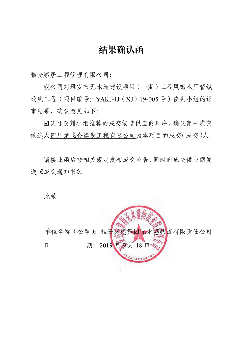 雅安交建集團(tuán)無(wú)水港物流有限責(zé)任公司雅安市無(wú)水港建設(shè)項(xiàng)目(一期)工程鳳鳴水廠管線(xiàn)改線(xiàn)工程競(jìng)爭(zhēng)性談判結(jié)果公示