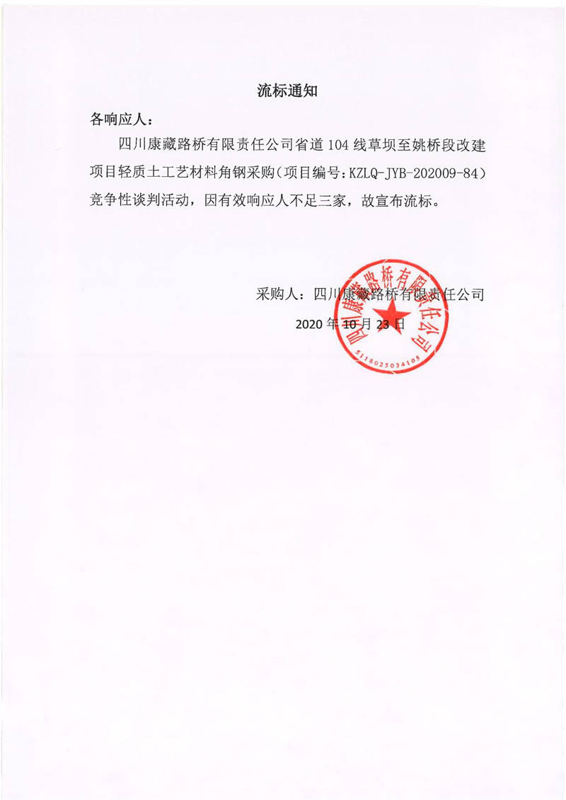 四川康藏路橋有限責任公司省道104線草壩至姚橋段改建項目輕質土工藝材角鋼采購項目流標通知