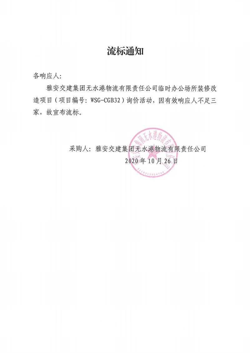 雅安交建集團(tuán)無(wú)水港物流有限責(zé)任公司臨時(shí)辦公場(chǎng)所裝修改造項(xiàng)目流標(biāo)通知