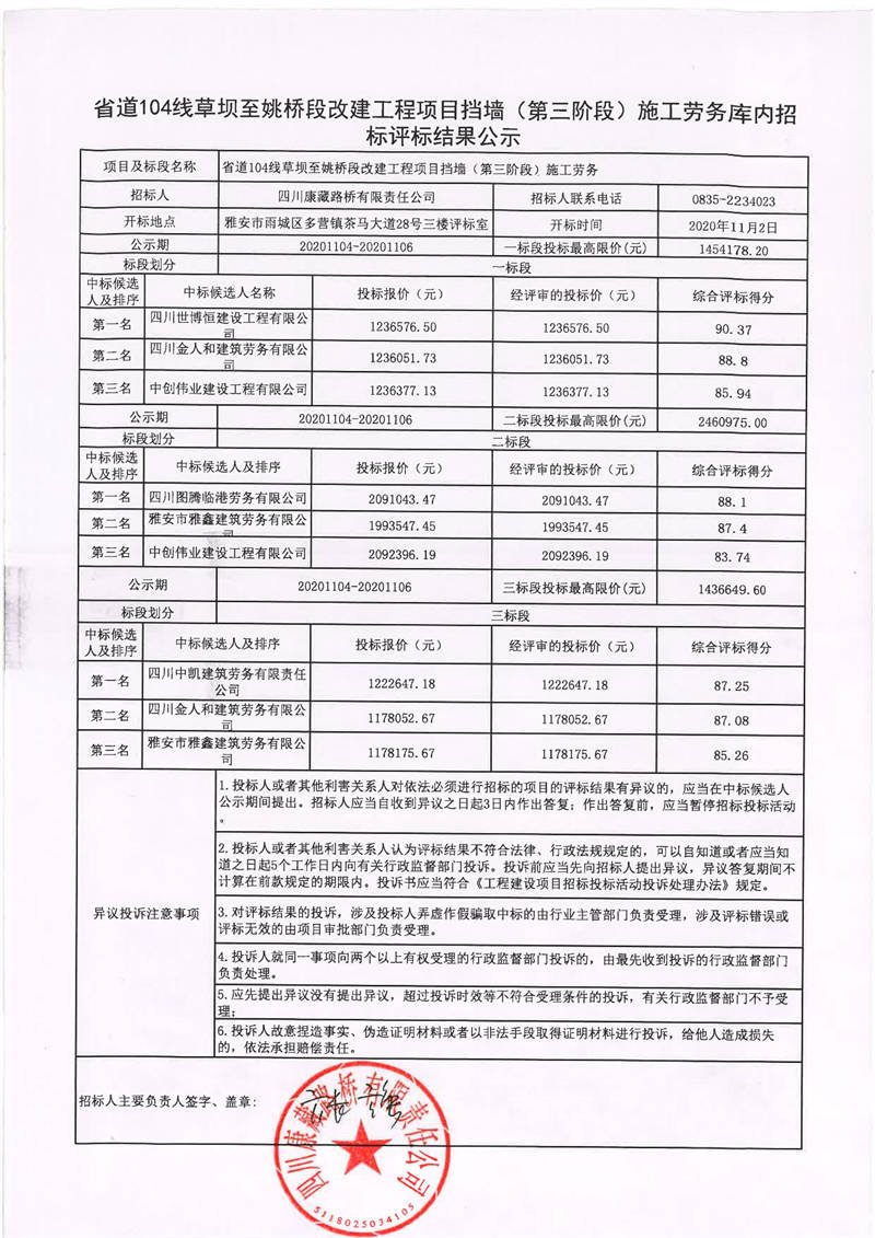 四川康藏路橋有限責任公司省道104線草壩至姚橋段改建工程項目擋墻(第三階段)施工勞務庫內招標評標結果公示