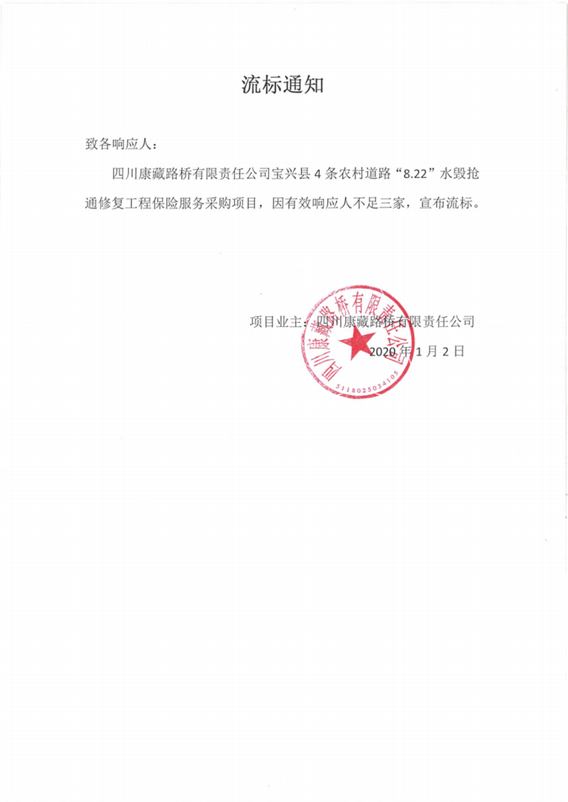 四川康藏路橋有限責(zé)任公司寶興縣4條農(nóng)村道路“8.22”水毀搶通修復(fù)工程保險服務(wù)采購項(xiàng)目流標(biāo)通知