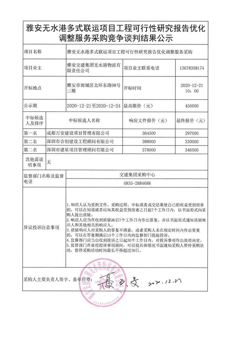 雅安交建集團無水港物流有限責任公司雅安無水港多式聯(lián)運項目工程可行性研究報告優(yōu)化調(diào)整服務采購競爭談判結果公示