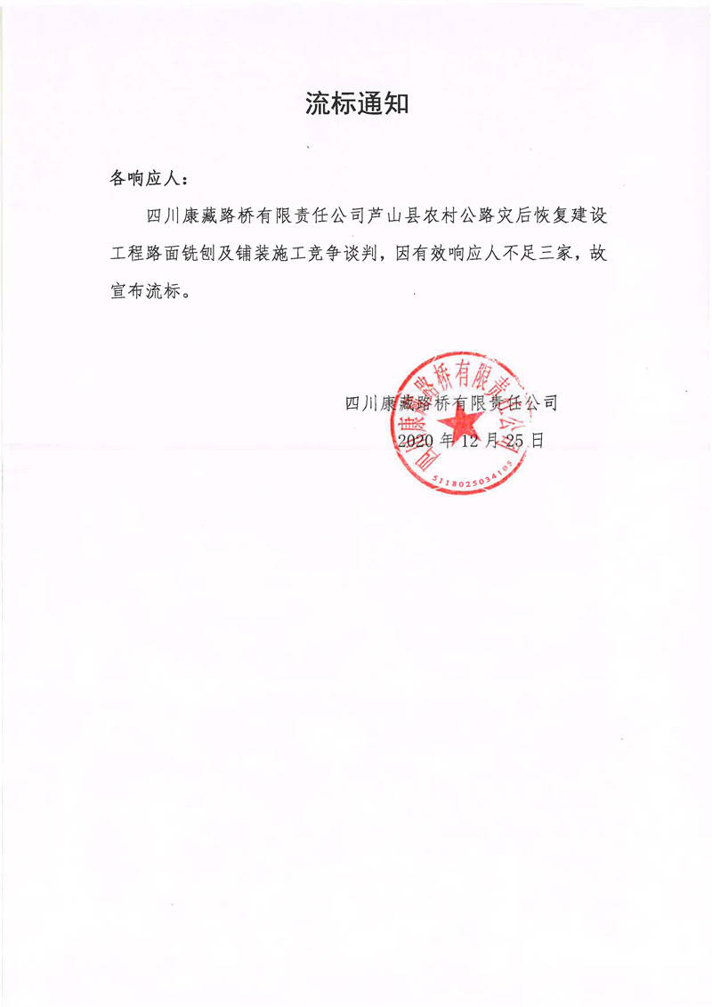 四川康藏路橋有限責任公司蘆山縣農村公路災后恢復建設工程路面銑刨及鋪裝施工流標通知