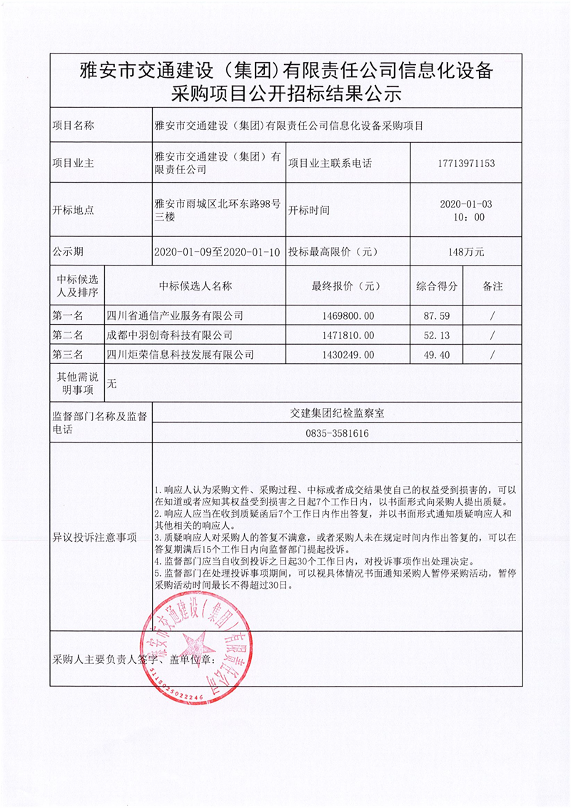 雅安市交通建設(shè)(集團(tuán))有限責(zé)任公司信息化設(shè)備采購項(xiàng)目公開招標(biāo)結(jié)果公示