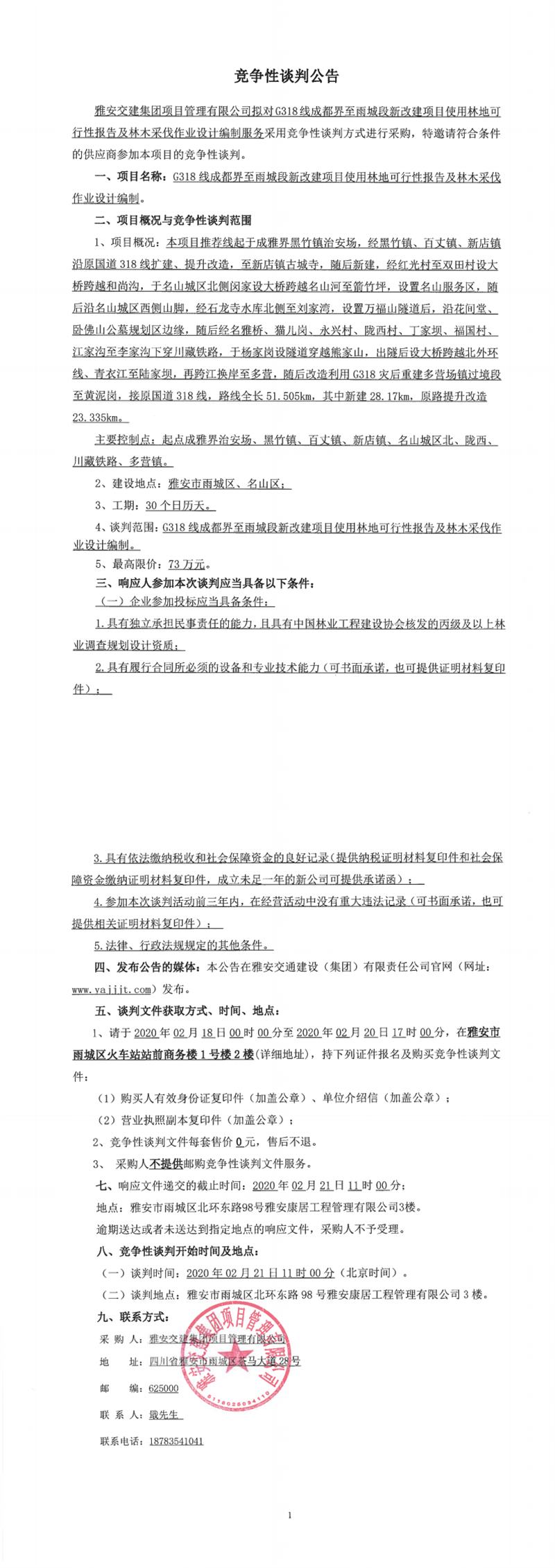 雅安交建集團(tuán)項(xiàng)目管理有限公司G318線成都界至雨城段新改建項(xiàng)目使用林地可行性報(bào)告及林木采伐作業(yè)設(shè)計(jì)編制競爭性談判公告