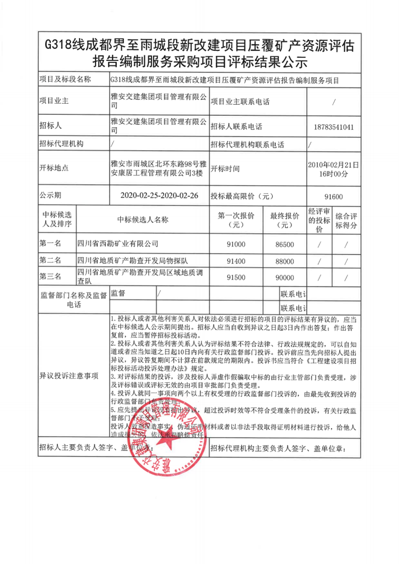 雅安交建集團(tuán)項目管理有限公司G318線成都界至雨城段新改建項目壓覆礦產(chǎn)資源評估報告編制服務(wù)采購項目評標(biāo)結(jié)果公示