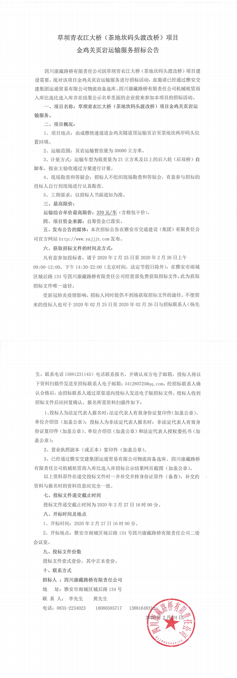四川康藏路橋有限責(zé)任公司草壩青衣江大橋(茶地坎碼頭渡改橋)項(xiàng)目金雞關(guān)頁(yè)巖運(yùn)輸服務(wù)招標(biāo)公告