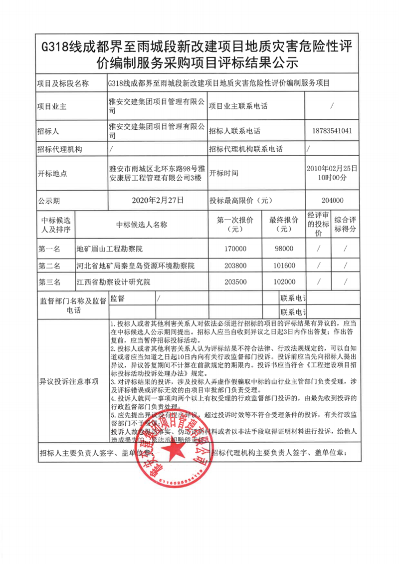 雅安交建集團(tuán)項目管理有限公司G318線成都界至雨城段新改建項目地質(zhì)災(zāi)害危險性評價編制服務(wù)項目評標(biāo)結(jié)果公示