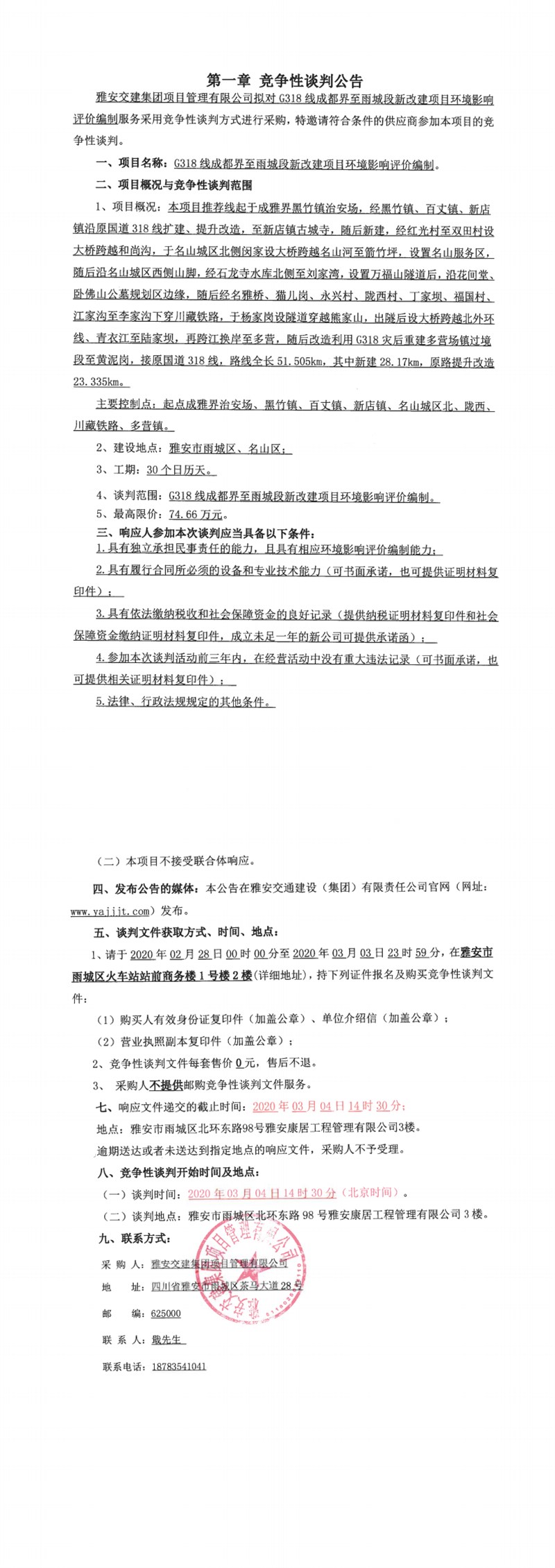 雅安交建集團(tuán)項(xiàng)目管理有限公司G318線成都界至雨城段新改建項(xiàng)目環(huán)境影響評(píng)價(jià)編制競爭性談判公告