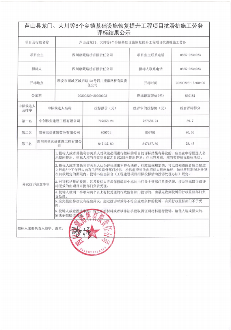 四川康藏路橋有限責任公司蘆山縣龍門、大川等8個鄉(xiāng)鎮(zhèn)基礎(chǔ)設(shè)施恢復(fù)提升工程項目抗滑樁施工勞務(wù)評標結(jié)果公示