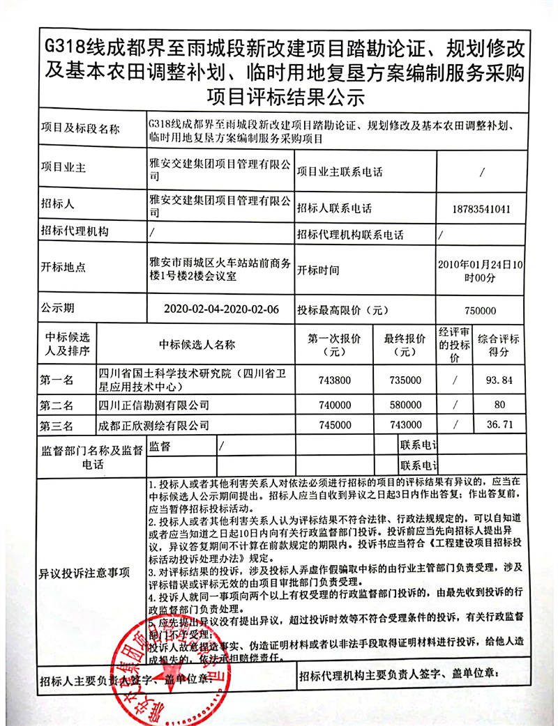 雅安交建集團(tuán)項(xiàng)目管理有限公司G318線成都界至雨城段新改建項(xiàng)目踏勘論證、規(guī)劃修改及基本農(nóng)田調(diào)整補(bǔ)劃、臨時(shí)用地復(fù)墾方案編制服務(wù)采購(gòu)項(xiàng)目評(píng)標(biāo)結(jié)果公示