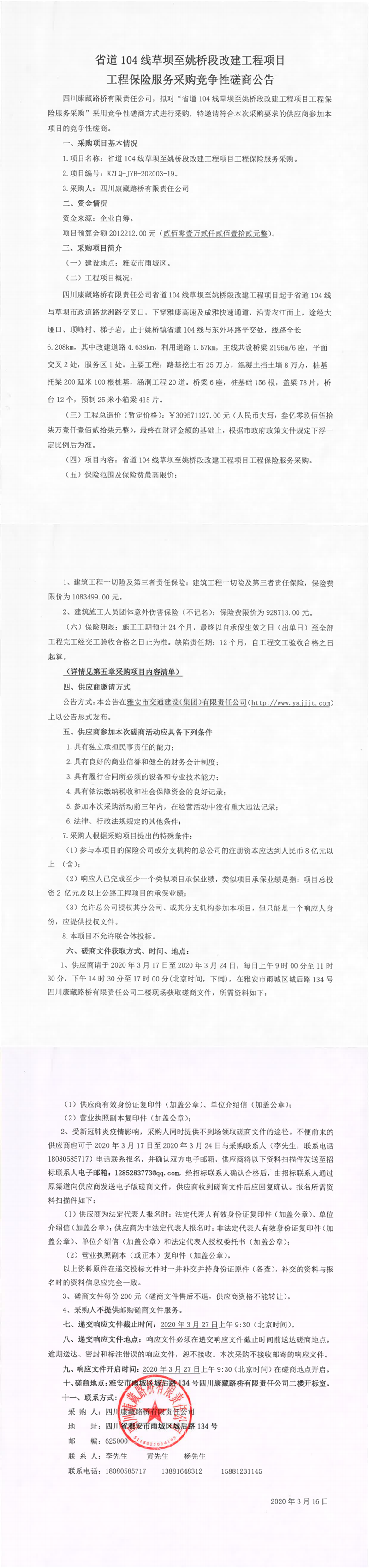 四川康藏路橋有限責(zé)任公司省道104線草壩至姚橋段改建工程項(xiàng)目工程保險服務(wù)采購競爭性磋商公告