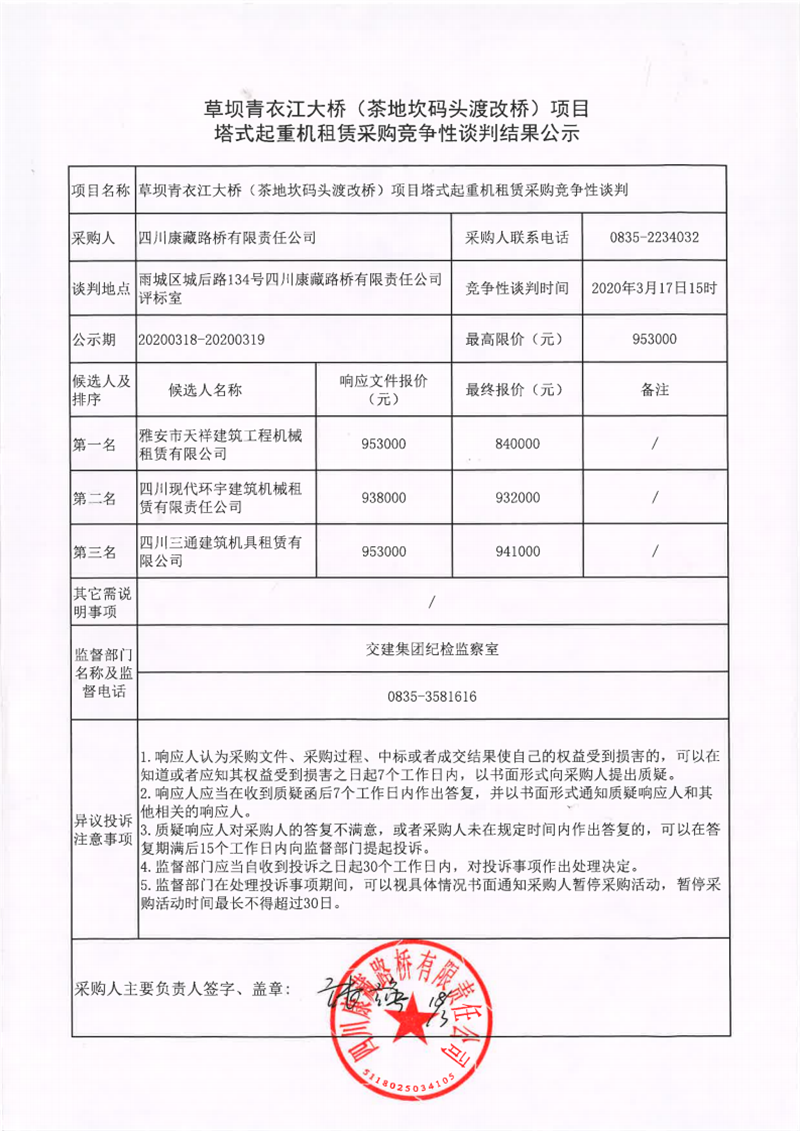 四川康藏路橋有限責任公司草壩青衣江大橋(茶地坎渡改橋)項目塔式起重機租賃采購競爭性談判結(jié)果公示