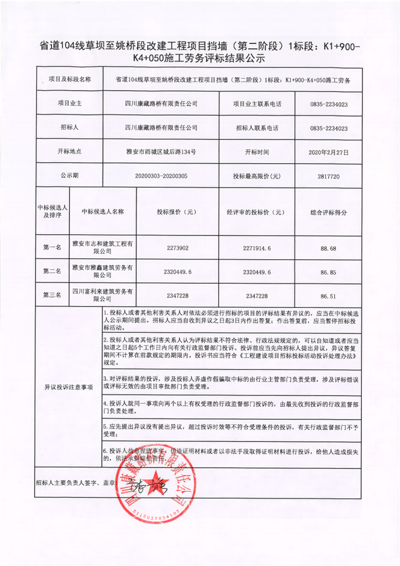 四川康藏路橋有限責任公司省道104線草壩至姚橋段改建工程項目擋墻(第二階段)1標段:K1+900-K4+050施工勞務評標結果公示