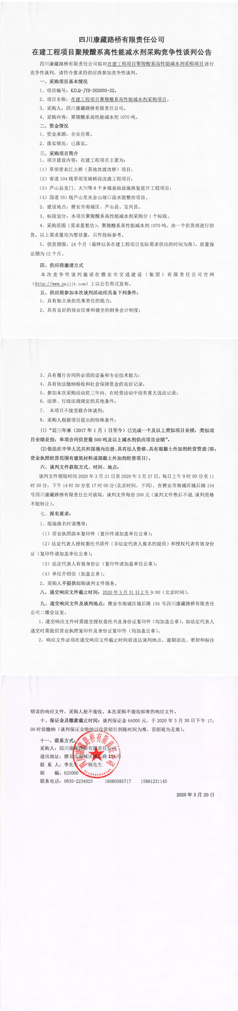 四川康藏路橋有限責任公司在建工程項目聚羧酸系高性能減水劑采購競爭性談判公告
