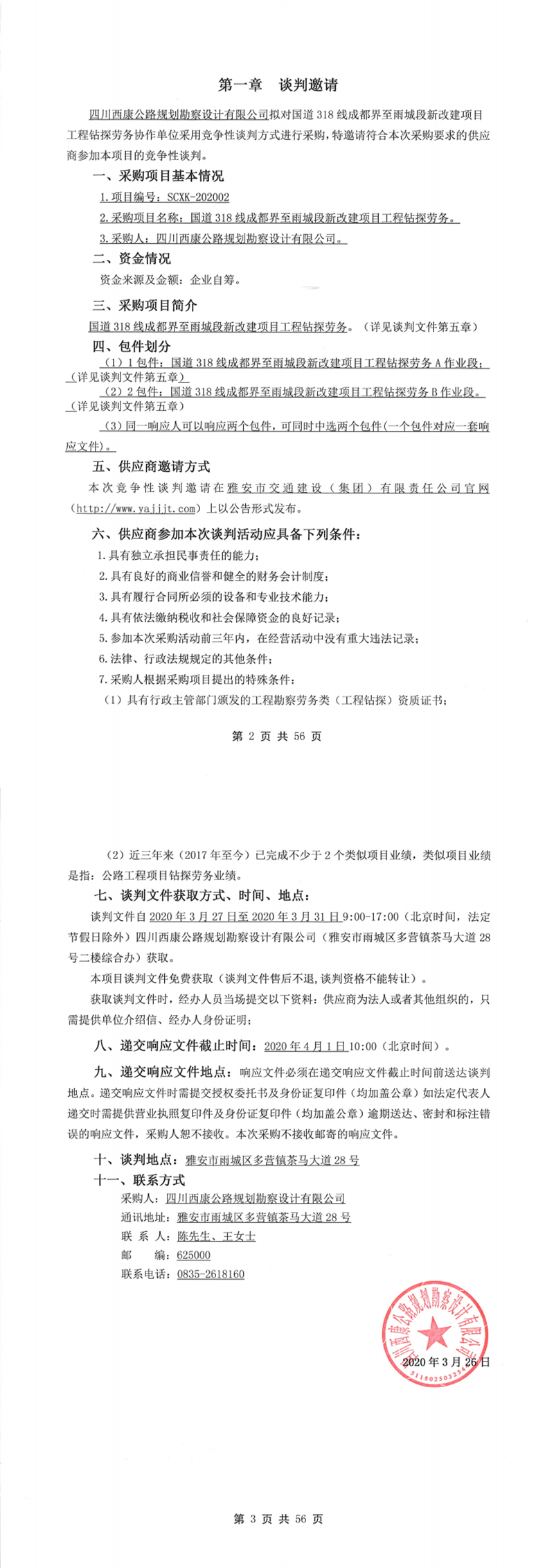 四川西康公路規(guī)劃勘察設(shè)計(jì)有限公司國(guó)道318線成都界至雨城段新改建項(xiàng)目工程鉆探勞務(wù)競(jìng)爭(zhēng)性談判公告