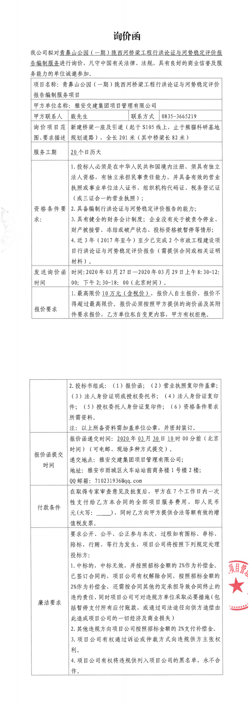 雅安交建集團(tuán)項(xiàng)目管理有限公司青鼻山公園(一期)隴西河橋梁工程行洪論證及河勢(shì)穩(wěn)定評(píng)價(jià)報(bào)告編制服務(wù)項(xiàng)目詢價(jià)函