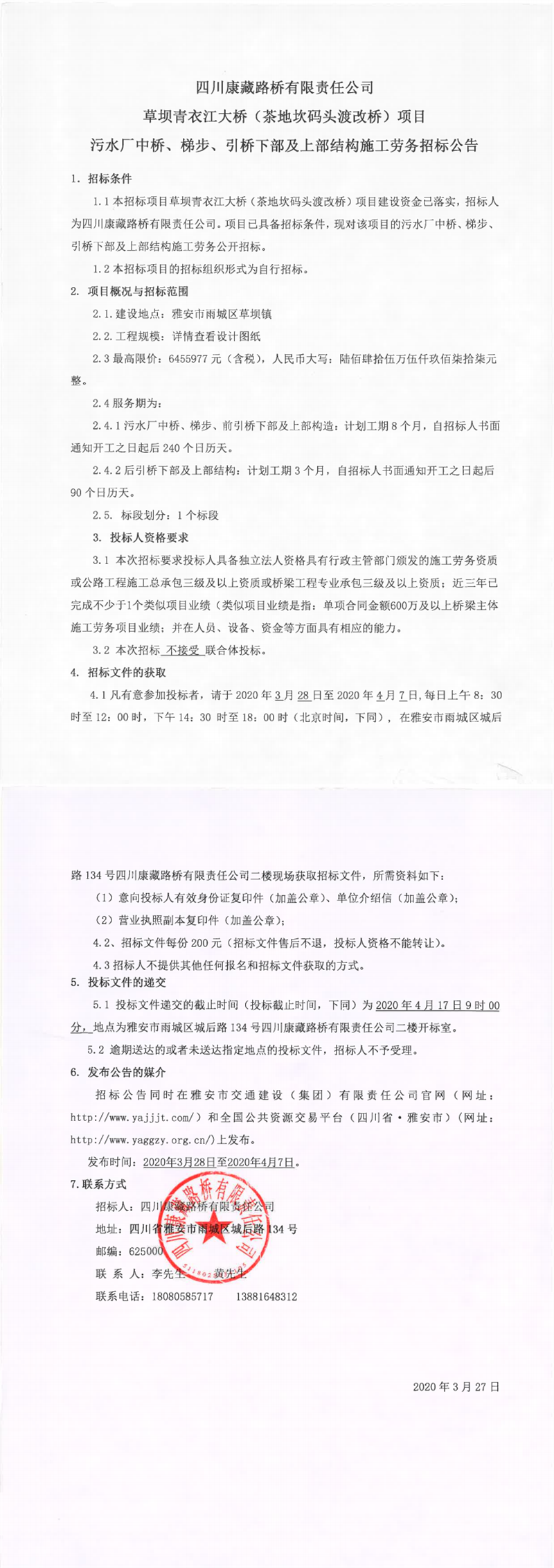 四川康藏路橋有限責(zé)任公司草壩青衣江大橋(茶地坎碼頭渡改橋)項(xiàng)目主橋墩柱及上部結(jié)構(gòu)施工勞務(wù)招標(biāo)公告