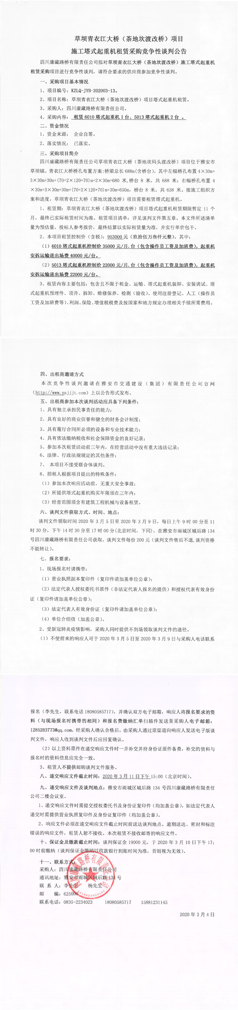 四川康藏路橋有限責(zé)任公司草壩青衣江大橋(茶地坎渡改橋)項(xiàng)目施工塔式起重機(jī)租賃采購(gòu)競(jìng)爭(zhēng)性談判公告