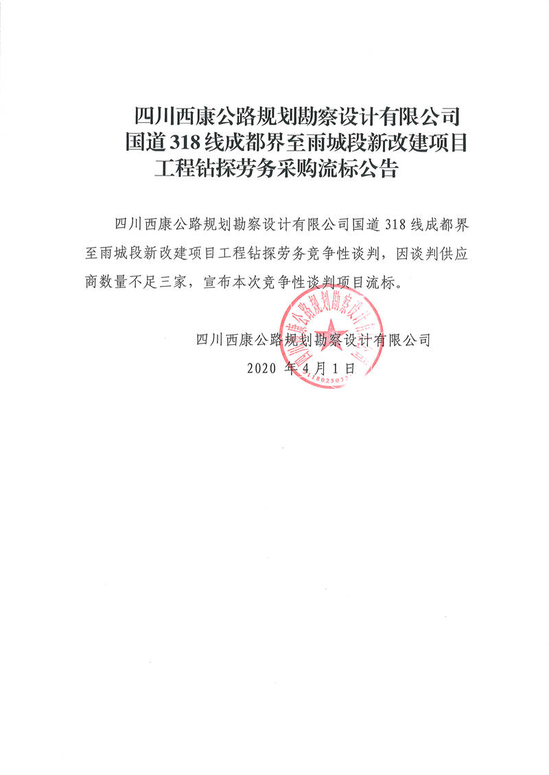 四川西康公路規(guī)劃勘察設(shè)計(jì)有限公司國(guó)道318線成都界至雨城段新改建項(xiàng)目工程鉆探勞務(wù)采購流標(biāo)公告