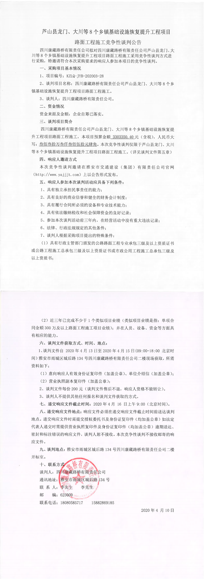 四川康藏路橋有限責(zé)任公司蘆山縣龍門(mén)、大川等8個(gè)鄉(xiāng)鎮(zhèn)基礎(chǔ)設(shè)施恢復(fù)提升工程項(xiàng)目路面工程施工競(jìng)爭(zhēng)性談判公告