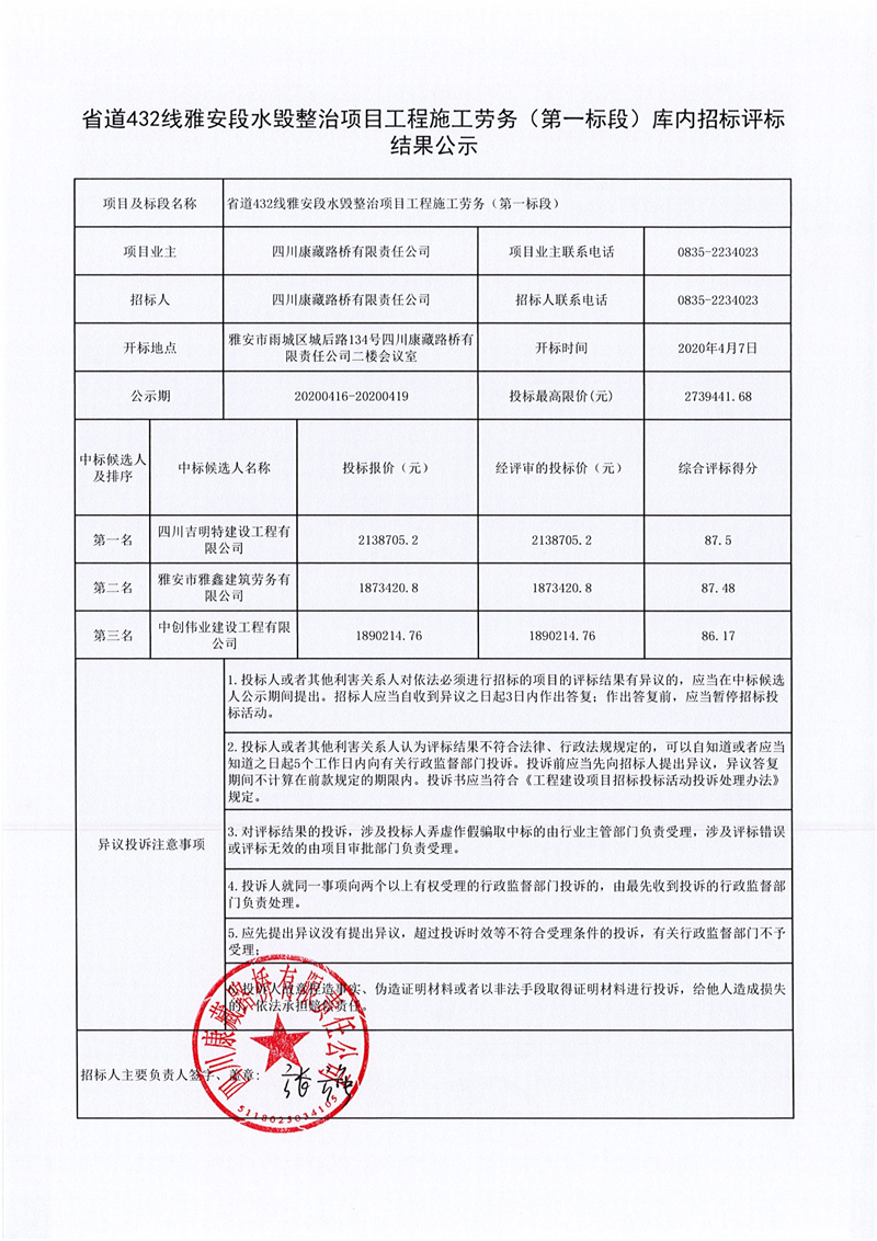 四川康藏路橋有限責(zé)任公司省道432線雅安段水毀整治項(xiàng)目工程施工勞務(wù)(第一標(biāo)段)庫內(nèi)招標(biāo)評標(biāo)結(jié)果公示