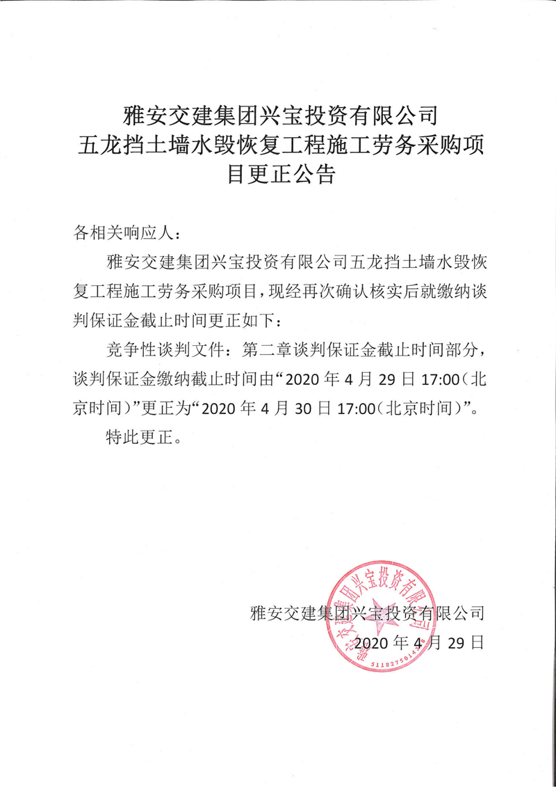 雅安交建集團興寶投資有限公司五龍擋土墻水毀恢復(fù)工程施工勞務(wù)采購項目更正公告