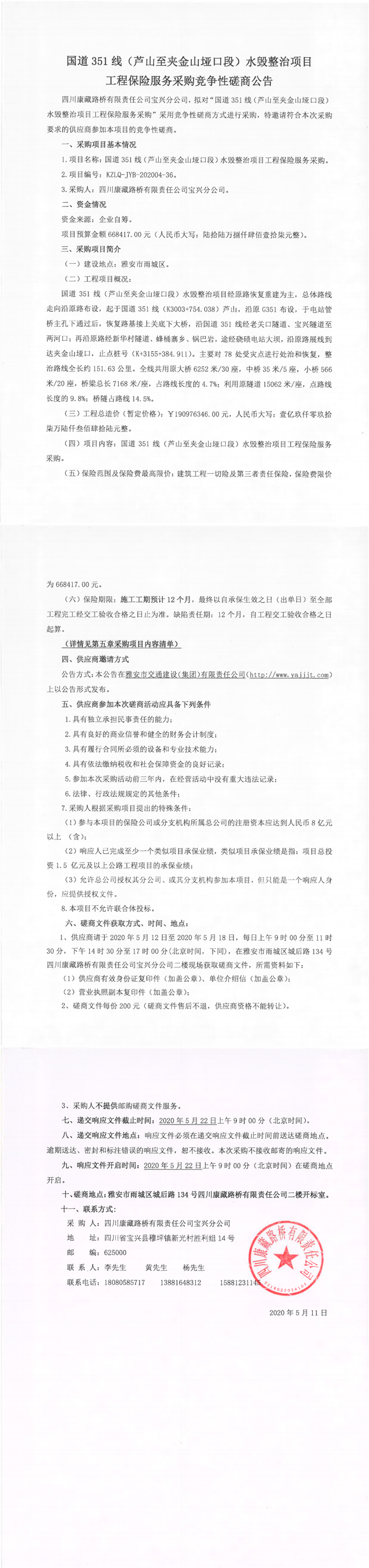 四川康藏路橋有限責(zé)任公司寶興分公司國道351線(蘆山至夾金山埡口段)水毀整治項目工程保險服務(wù)采購競爭性磋商公告