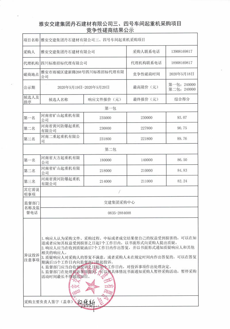 雅安交建集團(tuán)丹石建材有限公司三、四號(hào)車間起重機(jī)采購項(xiàng)目競爭性磋商結(jié)果公示