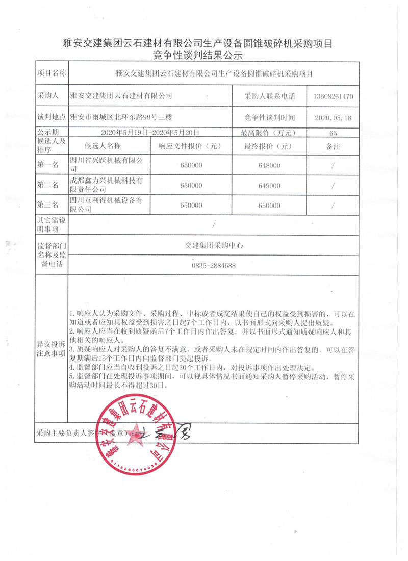 雅安交建集團(tuán)云石建材有限公司生產(chǎn)設(shè)備圓錐破碎機(jī)采購項目競爭性談判結(jié)果公示