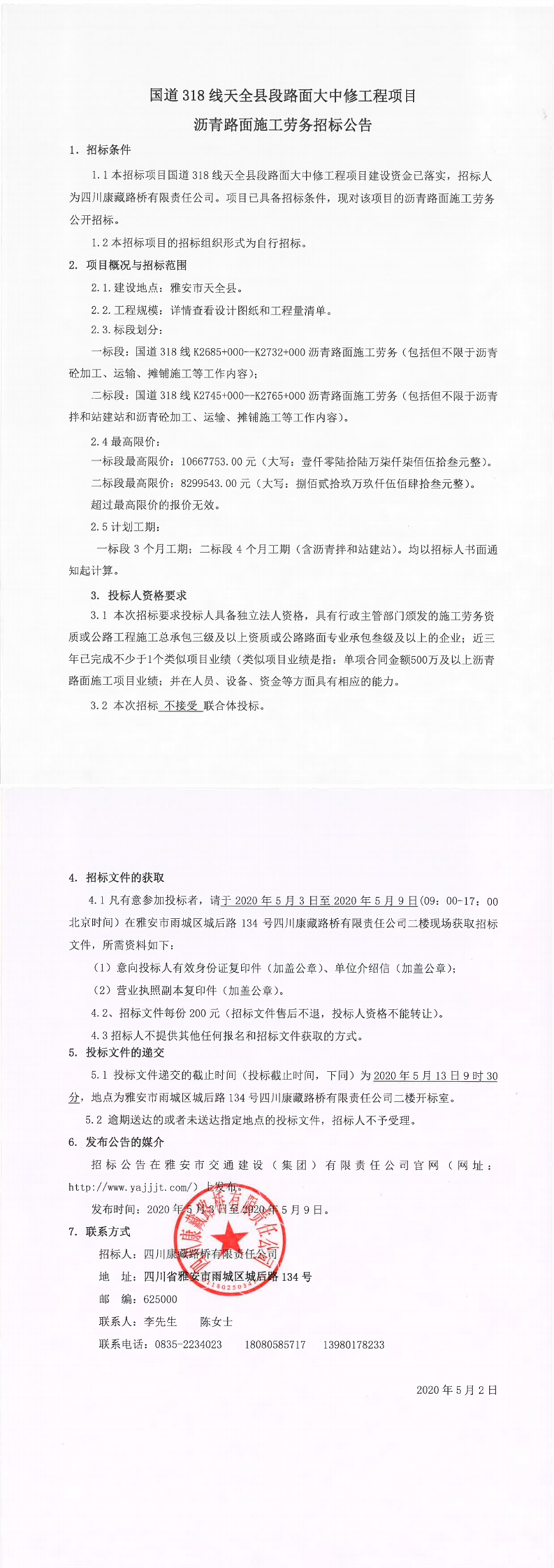 四川康藏路橋有限責任公司國道318線天全縣段路面大中修工程項目瀝青路面施工勞務招標公告