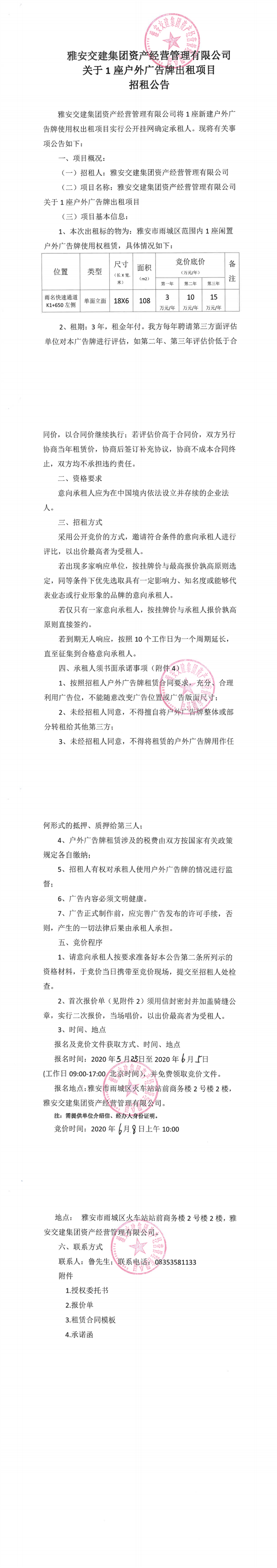 雅安交建集團(tuán)資產(chǎn)經(jīng)營(yíng)管理有限公司關(guān)于1座戶(hù)外廣告牌出租項(xiàng)目招租公告