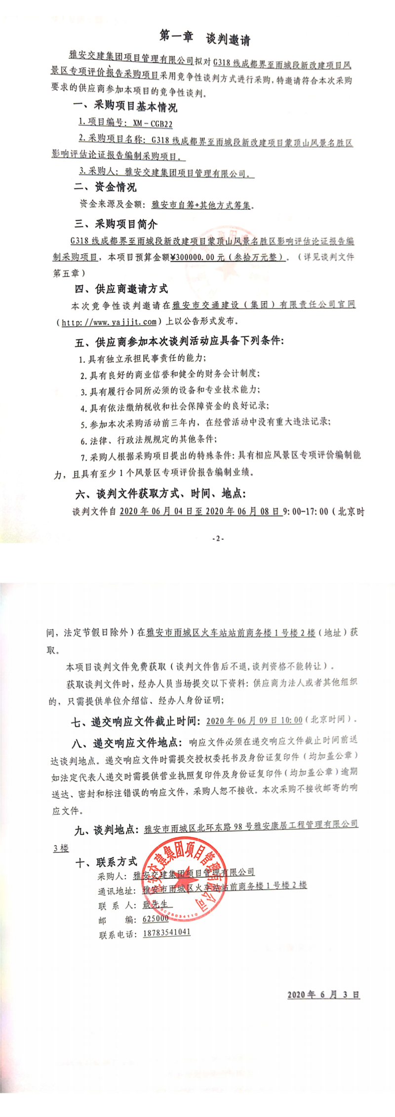 雅安交建集團項目管理有限公司G318線成都界至雨城段新改建項目蒙頂山風(fēng)景名勝區(qū)影響評估論證報告編制采購項目競爭性談判公告